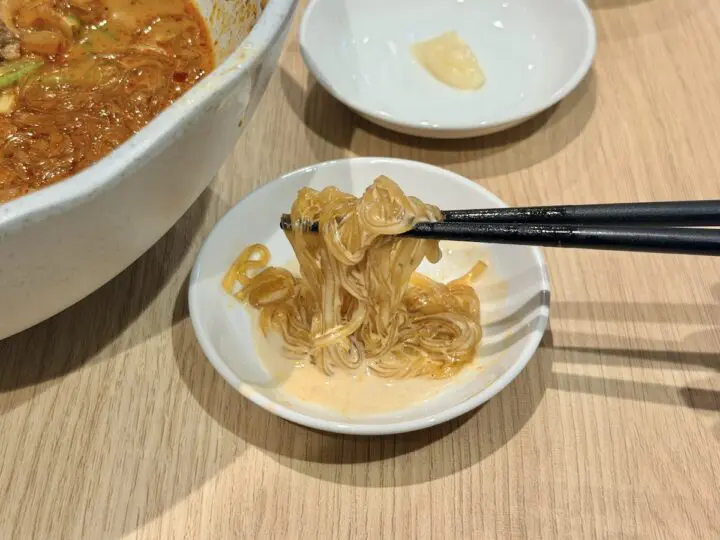麺はカップ麺でもおなじみの「さつま芋麺」を選択。これがもう、プリップリの極みよ!ツルツルッとした喉越しが最高に気持ちいい。