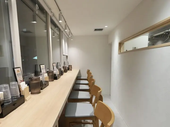店内は、その遊び心とは裏腹に、白を基調としたクリーンな空間。カウンター席とテーブル席を合わせて全23席。