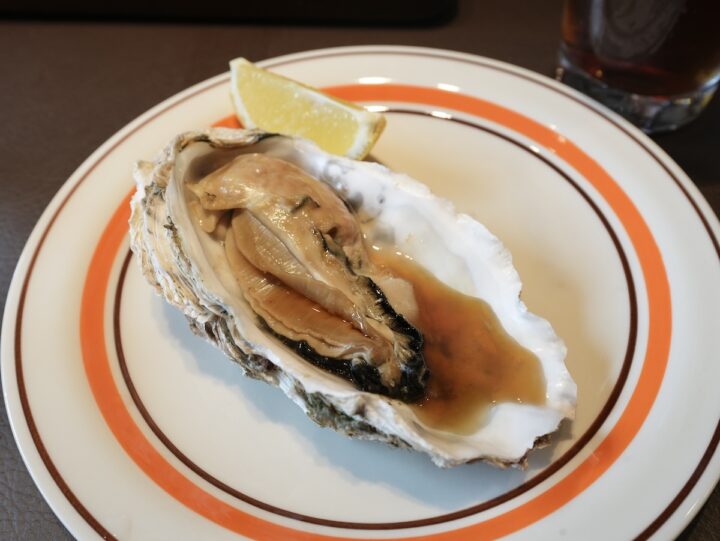 最初に登場したのは「焼カキ(カキ醤油)」。レモンをサッと絞ってひと口運ぶと…ぷりっぷりの身から、磯の香りと濃厚な旨味が溢れ出す。カキ醤油を垂らして…あ、これいきなりワイン止まらないやつ。