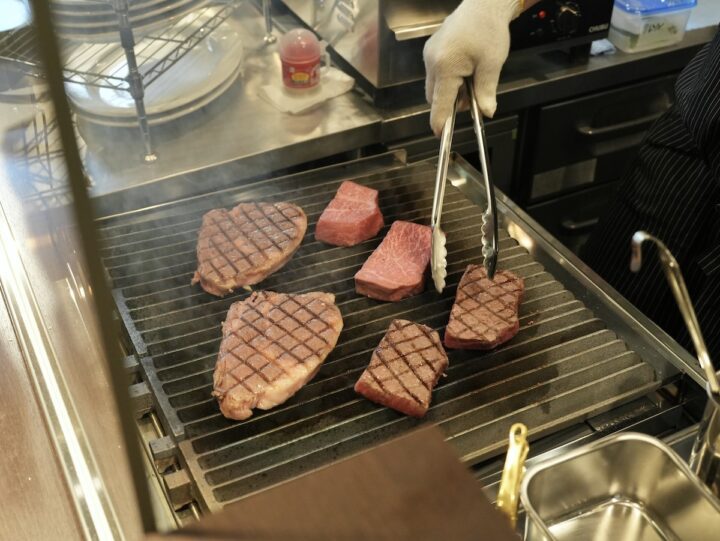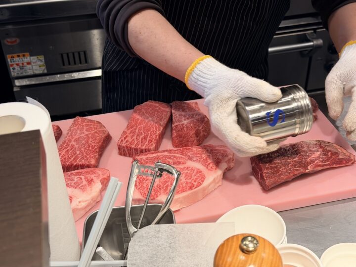 「いろんな肉をステーキにして食べ比べた結果、上質でありながら脂が乗りすぎない、程よいサシの入った肉を厳選して提供します」と語る担当者さん。黒毛和牛が敬遠されがちな脂っこさを払拭し、お肉本来の旨味を最後まで美味しく味わえる絶妙なグレード調整。なんとも肉い演出。