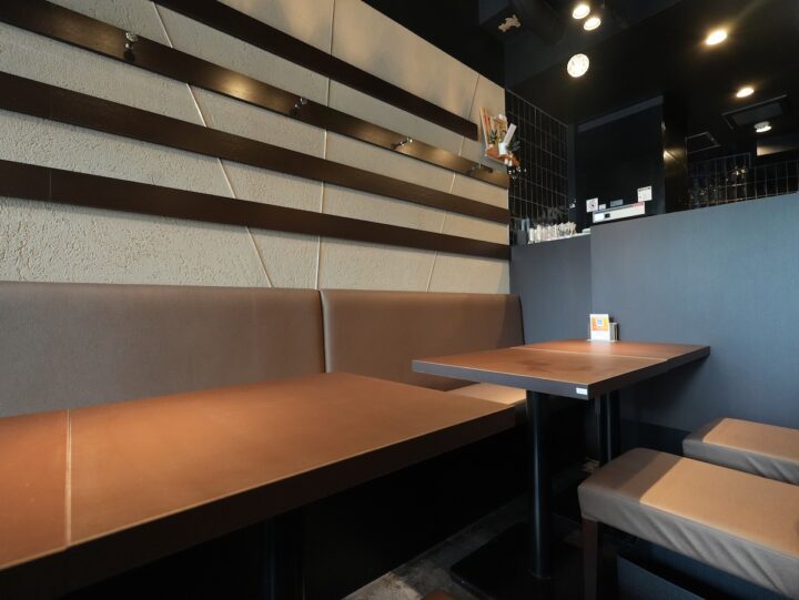 扉を開けると、井の頭通りの喧騒を忘れさせるような落ち着いた空間。1階はオープンな厨房とテーブル席が少々、2階が広々とテーブル席が多く全44席。木目を基調としたシックなブラウンで統一され、ゆったりと腰を下ろせるソファ席やテーブル席が並びます。