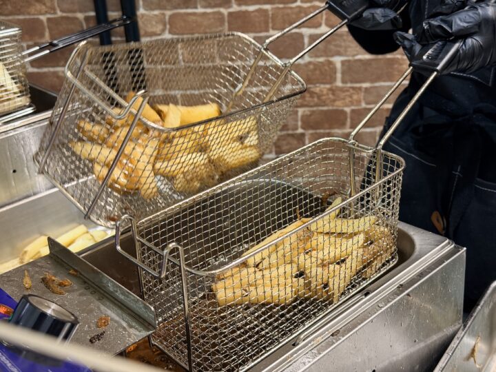 注文口のすぐ隣にはフライヤーがあり、太めにカットされたポテトがジュワワワ〜ッと音を立てて揚がっていく様子が目の前で見られます。このライブ感たまらない。