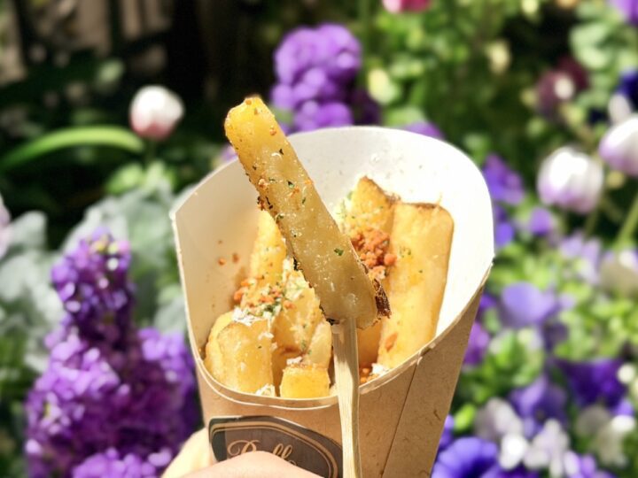 パッケージから顔を出しているのは、ゴロゴロと大ぶりで太めにカットされたフリッツ。そしてその上には削られたパルメジャーノチーズ、香ばしいクリスピーなベーコン(サービス)とパセリが彩りを添えています。