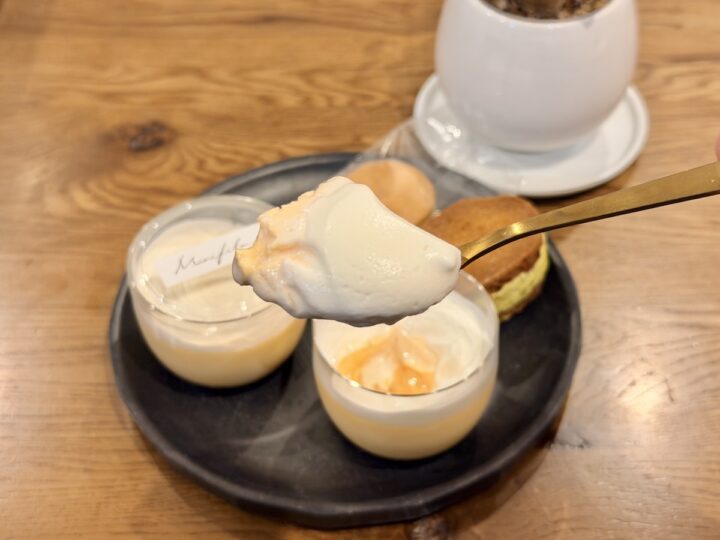 舌の上でスッと消えていく至福のなめらかさよ。那須御養卵の濃いコクと、北海道産牛乳・生クリームのリッチなミルク感が口の中を支配してくる。底から現れるほんのりビターなカラメルが、濃厚なプリンをキュッと引き締め、絶妙なバランスに。生クリームが全体をまろやかに包み込んでいて、一口、また一口と止まりません。どうしよ、プリンは固め派だったけど、このとろけるプリンはすごく好き。