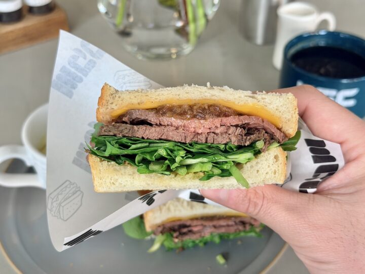 圧倒的なボリューム。厚切りのパンの間に、ローストビーフとルッコラがこれでもか!とぎっしり。なにこの肉い演出。隙間が全然無い。