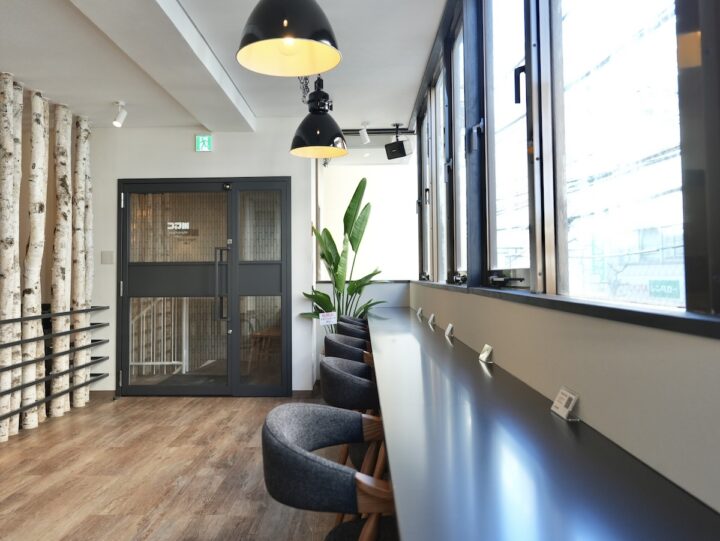 国分寺駅南口徒歩3分、ビルの階段を上がると雰囲気の良いエントランスが迎えてくれます。扉を開けると、広々とした空間が広がる。
