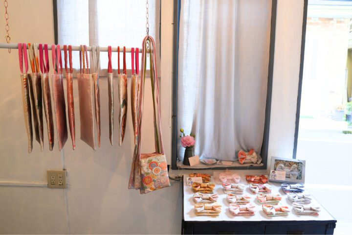 使われなくなったヴィンテージ帯を1点ずつほどき、バッグやアクセサリーへと再構築したウェアラブルアート(身に纏うアートピース)。