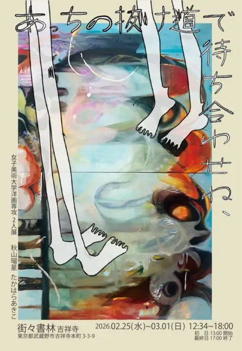【個展紹介文】 女子美術大学洋画専攻絵画コース 2年の高原亜希子と、版画コース2年の秋山瑠星による2人展です。 お互い本や映画、言葉に興味を持ち、それにインスピレーションを受け作品を制作しており、書店と併設している街々書林のギャラリーにて作品を展示します。言葉を大切にし、言葉を作品にしている私たちだからこその作品を、言葉で世界を展開する本たちが並ぶ書店のギャラリやーに展示し、そこでコミュニケーションが生まれれば良いと計画しております。 【作家情報】 髙原亜希子 (女子美術大学 洋画専攻 絵画コース2年) 日々の中で出会う言葉からインスピレーションを受け、新しいコミュニケーションの形を探る制作を行っている。 秋山 瑠星 (女子美術大学 洋画専攻 版画コース2年) 赤ちゃんが泣くことで情動を表すように、自身の制作も””もうひとつの言語””として捉え、言葉にできなかった言葉を作品として表現している。