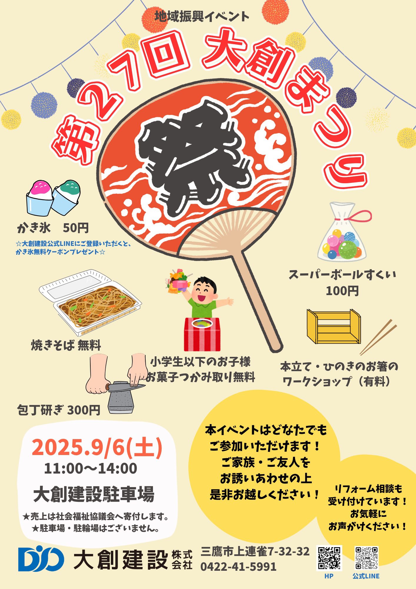 第27回大創まつりのお知らせです!! 日時:2025年9月6日(土)11時~14時 場所:三鷹市上連雀7-32-32 大創建設駐車場 ●焼きそば 無料! ●かきごおり 50円!※公式LINEおともだちの方へ「かき氷無料クーポン」プレゼント! ●スーパーボールすくい 100円! ●小学生以下のお客様!お菓子つかみ取り無料! ●桧のお箸と本立てを作ることができるワークショップもあります!(有料) ●包丁研ぎ1本300円!(1人3本まで) 建物に関するご相談も随時受け付けております! 是非皆様、ご家族ご友人をお誘いの上お越しください! 社員一同お待ちしております! ※駐車場・駐輪場はございません。